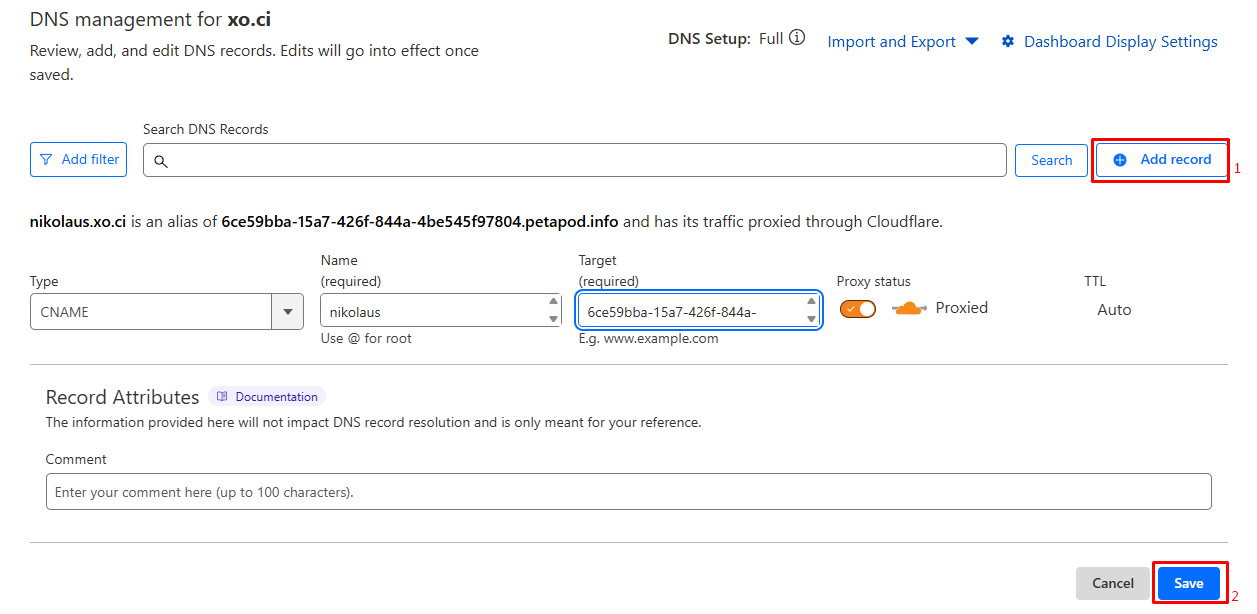 Fill in the CNAME record with the provided value (e.g., "6ce59bba-15a7-426f-844a-4be545f97804.petapod.info")