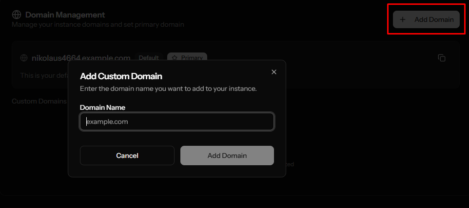 First of all you need click “Add Domain” then the popup modal will shown a domain name form like bellow